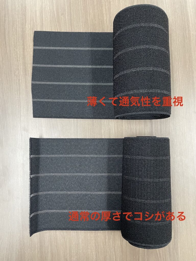 用途に併せた生地選びが重要になってきますので、厚さを2パターンご用意しています。通気性が必要な製品には少しでも薄くした生地、ガッチリ固定することが求められる製品には生地にコシがしっかりとした方が適しています。