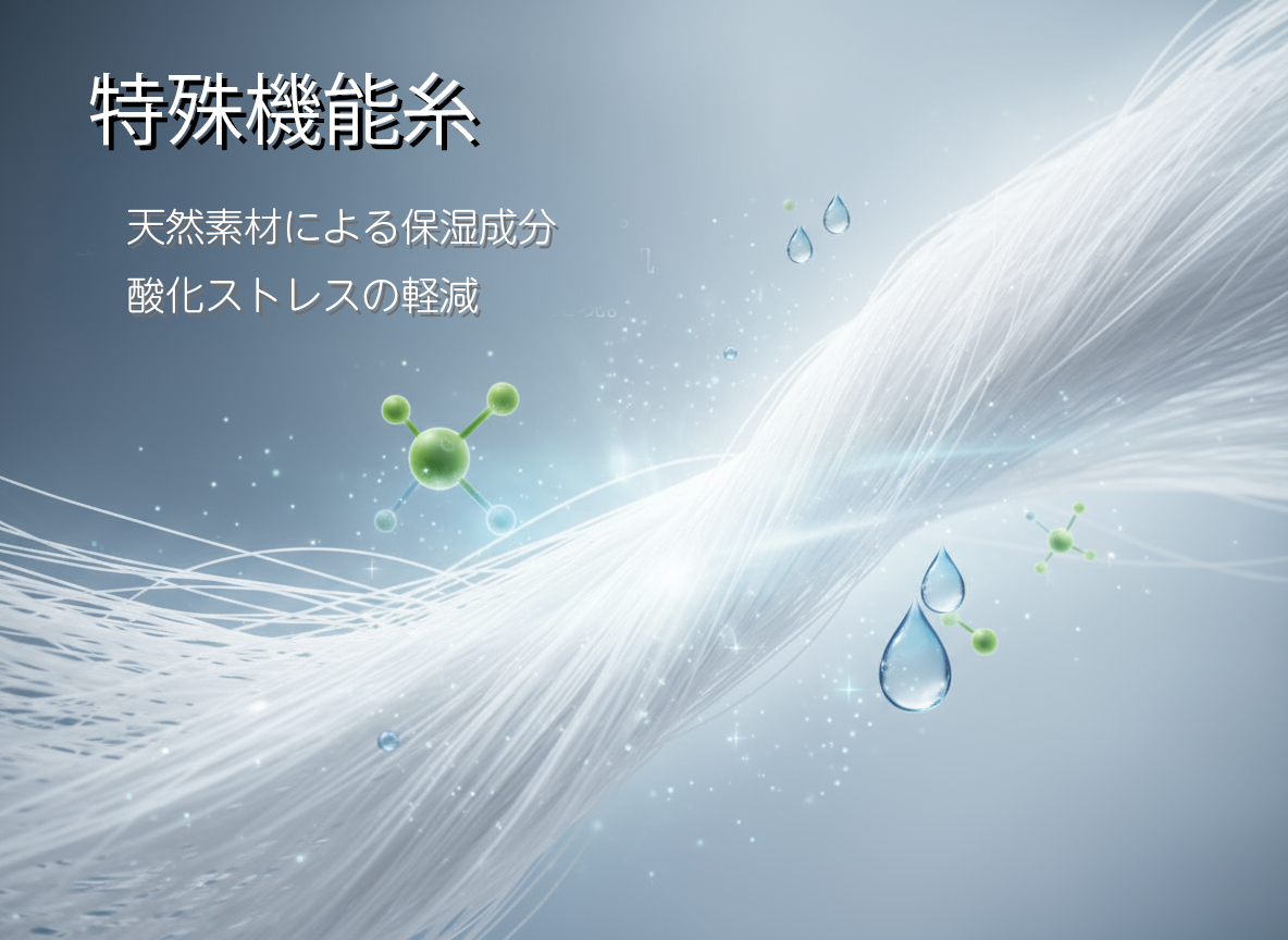 さらに、機能糸に配合された天然由来の保湿成分(例:セラミドなど)が肌の水分保持をサポートします。肌ざわりが非常になめらかで、乾燥しやすい季節や敏感肌にもやさしい着用感を実現します。この保湿成分は繊維内部に練り込まれているため、コーティング型とは異なり洗濯後も効果が持続。